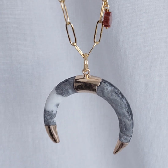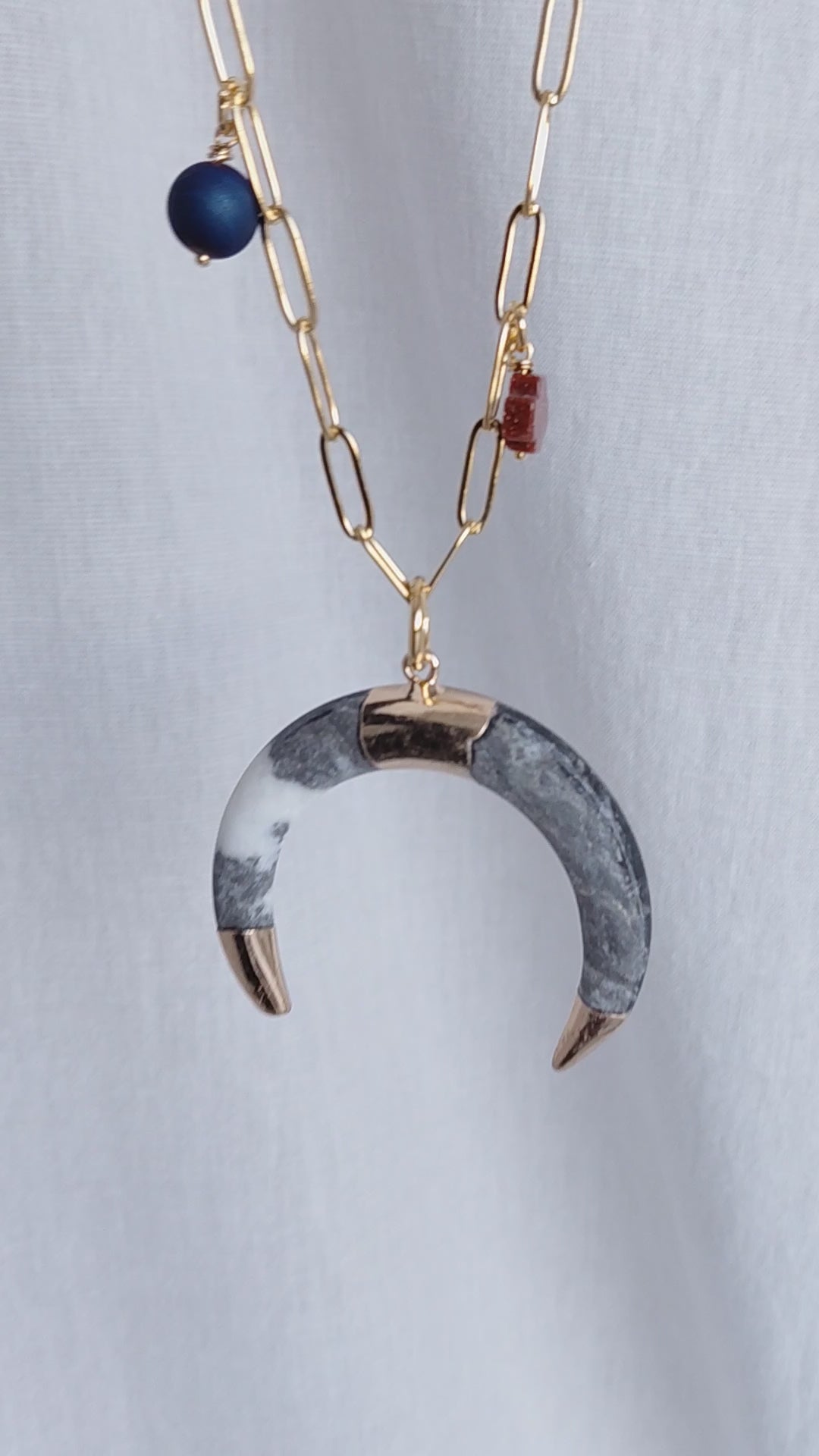 Sautoir chaine breloquée & pendentif pierre semi-précieuse effet marbre